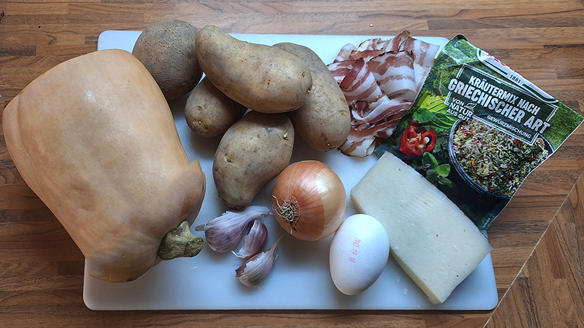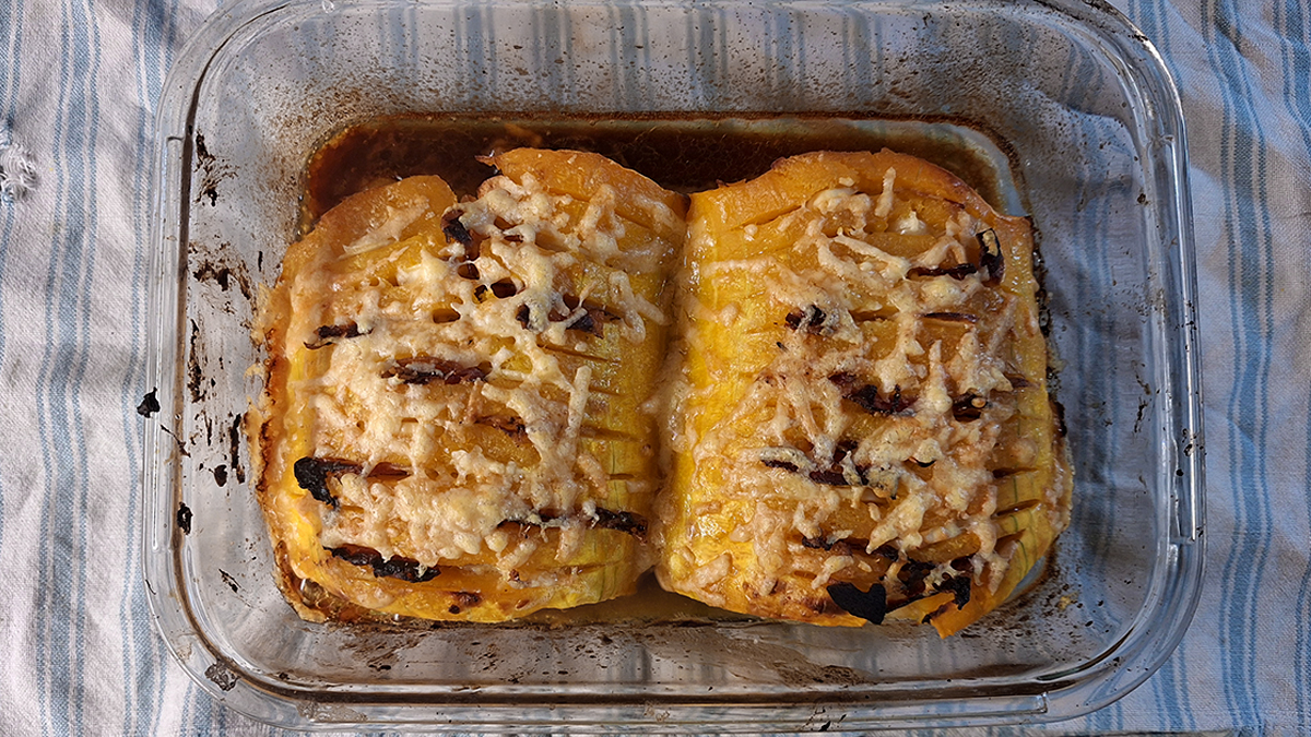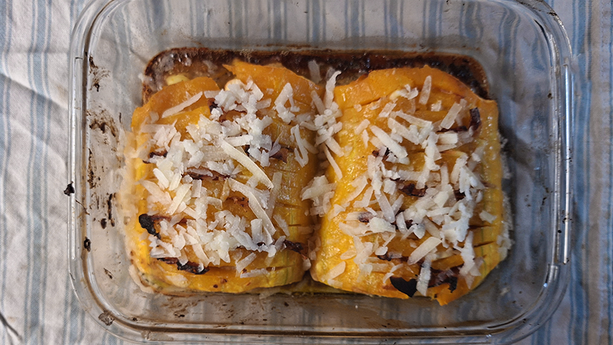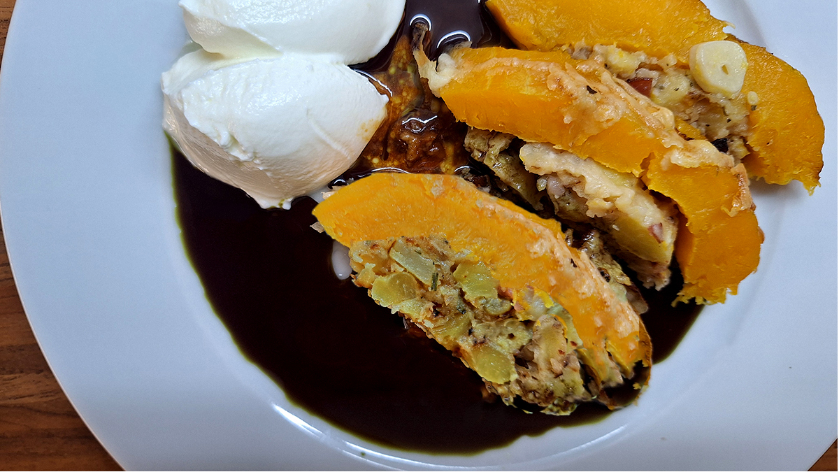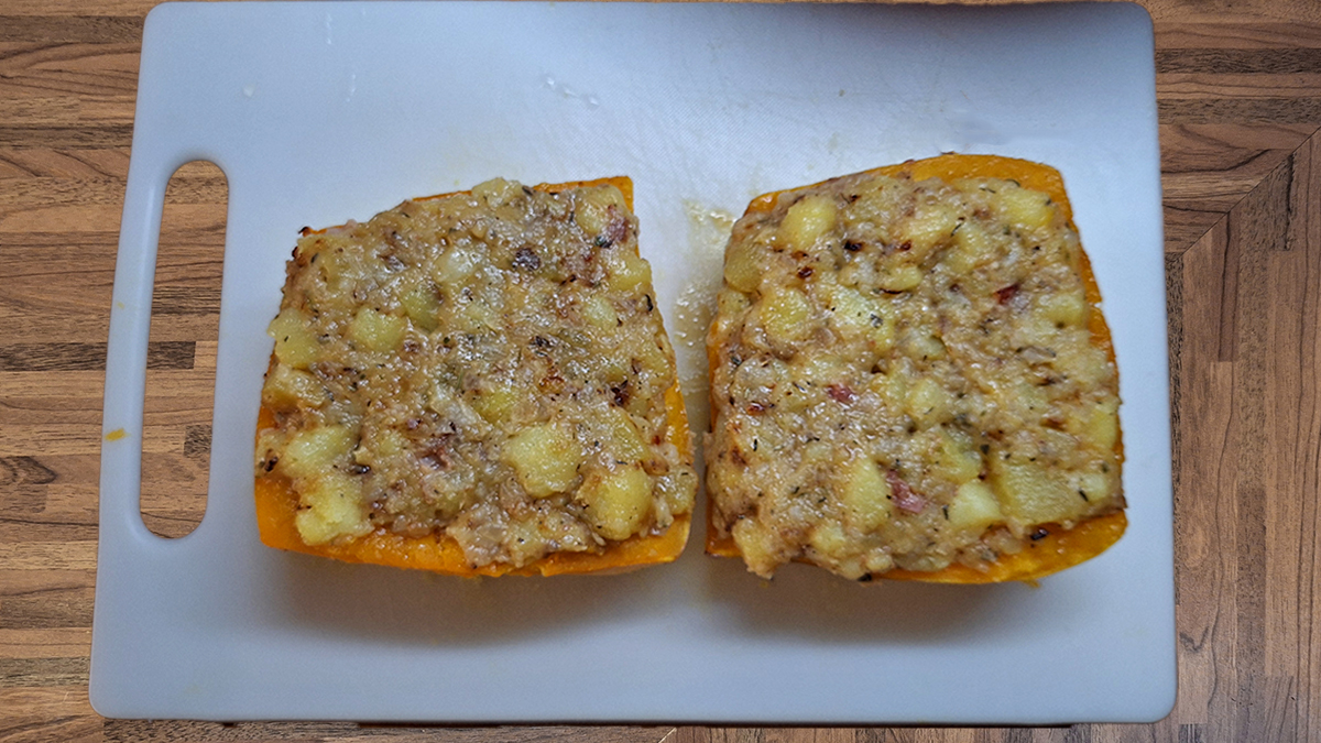 im Rohr gebackener, mit Speck und Knoblauch gespickter Butternuss mit Füllung aus Erdäpfeln, Zwiebel, Speck und Meseta butternusserdäpfelkürbispikantschafkäseüberbacken By lintschi12. Oktober 2025GemüseLeave a Comment on Kürbis mit Erdäpfelfüllung