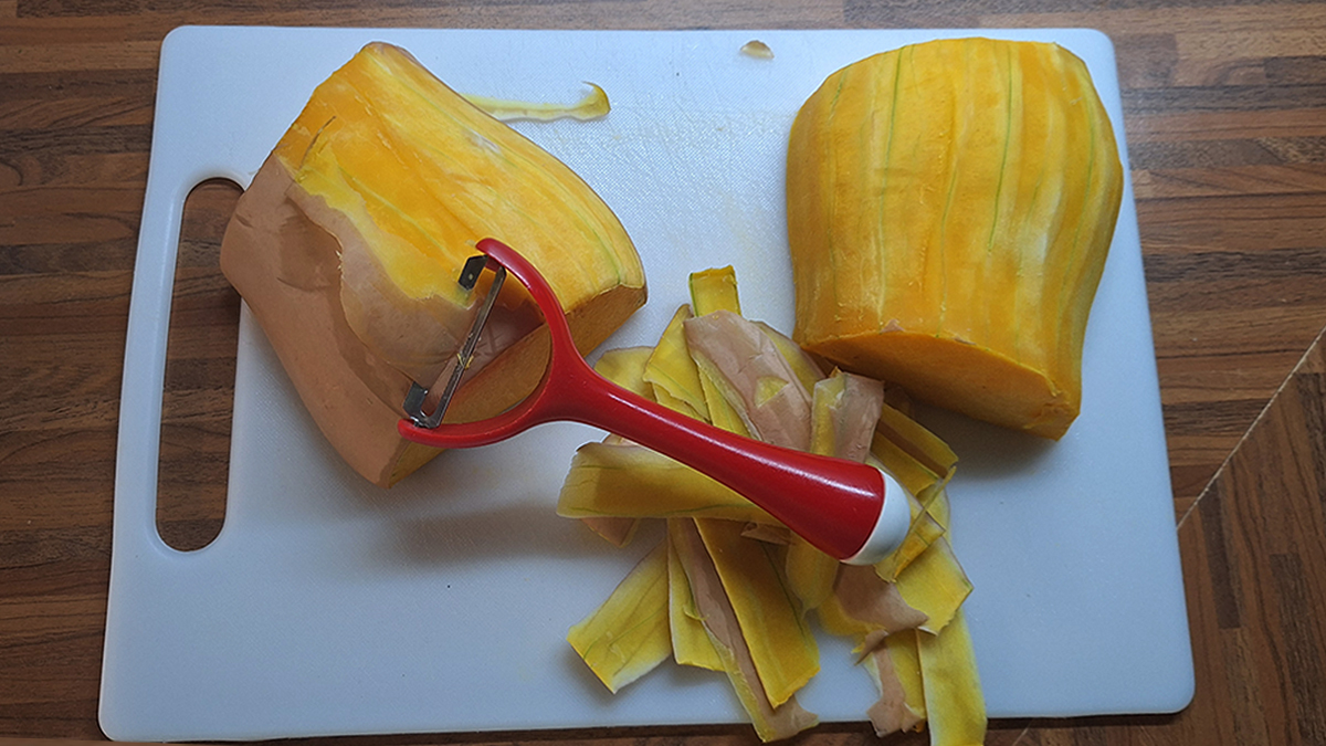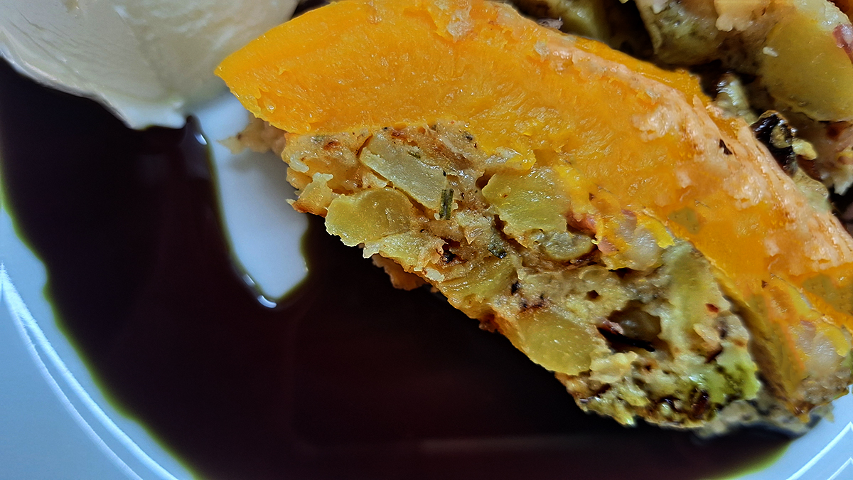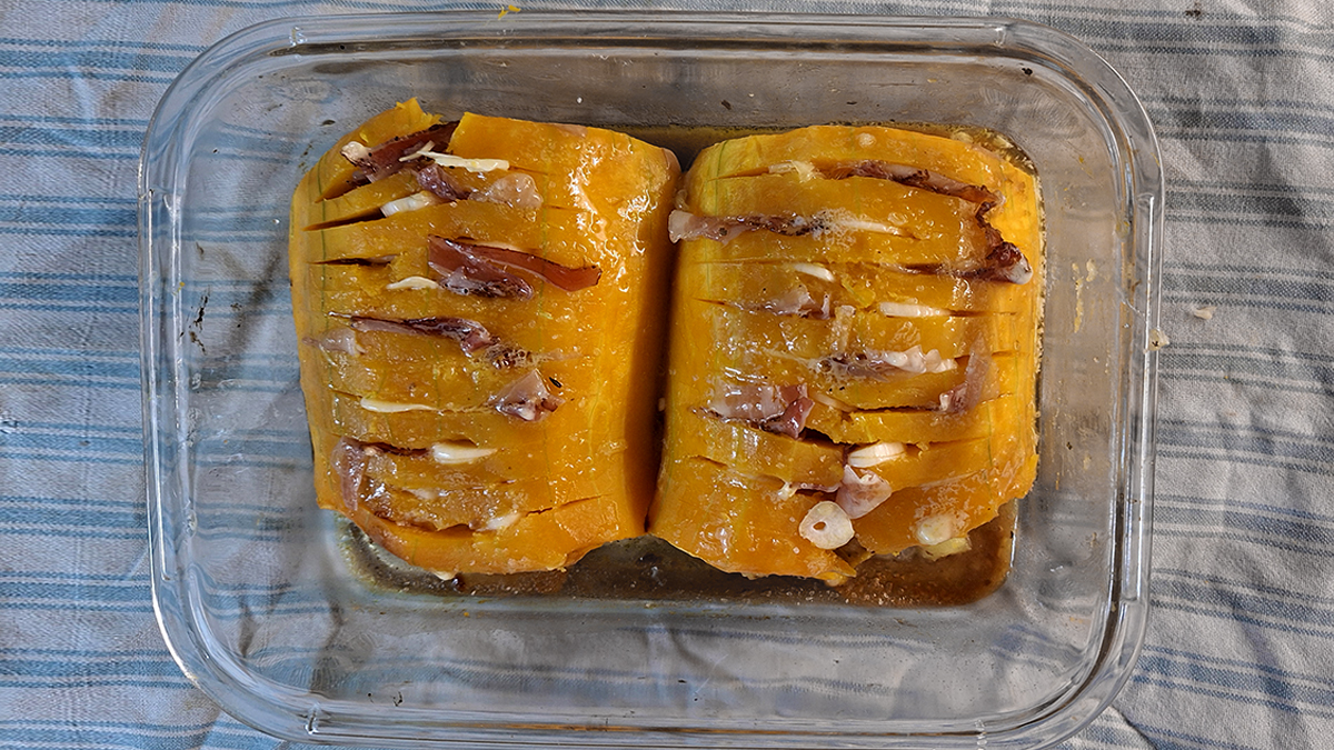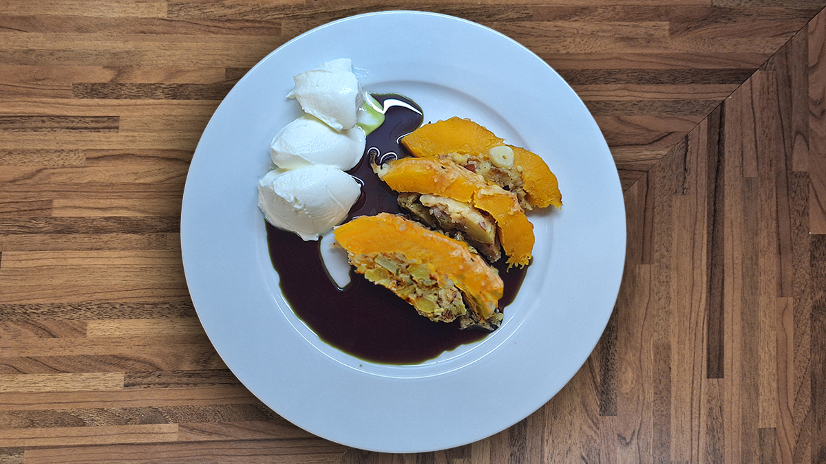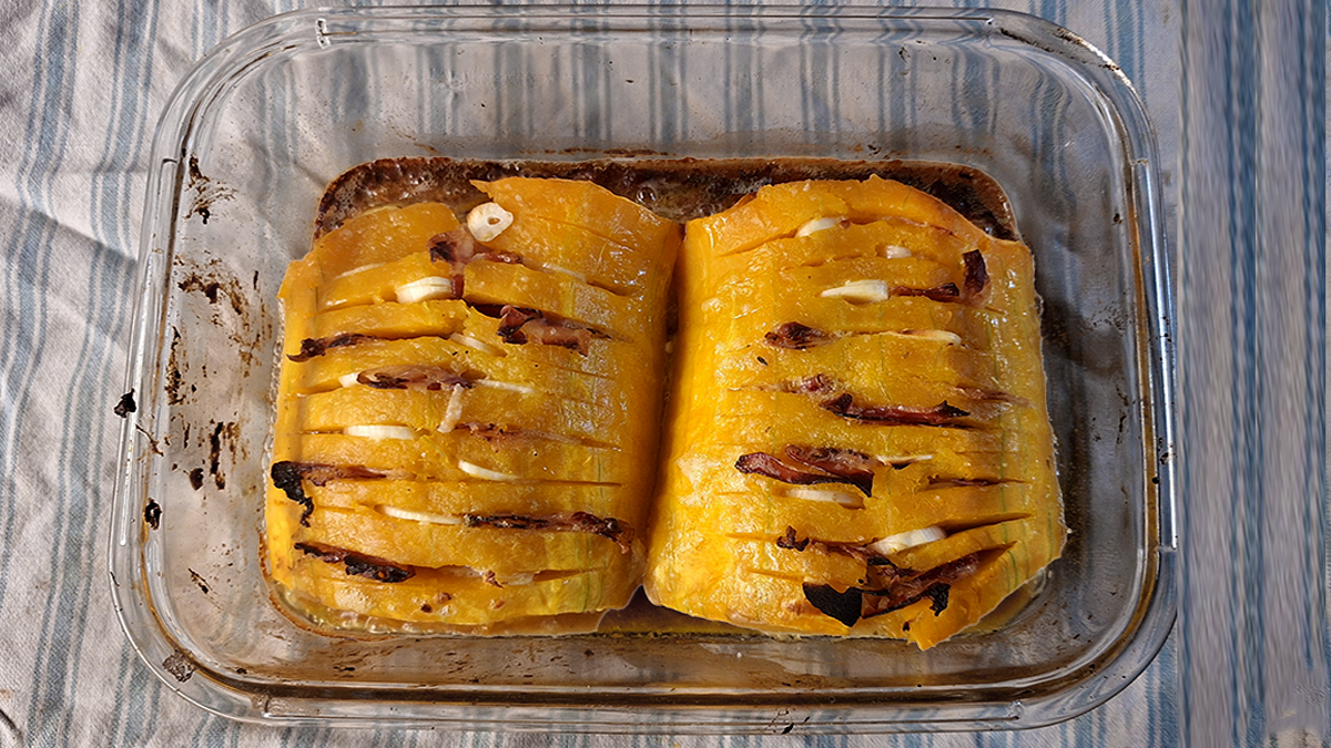 im Rohr gebackener, mit Speck und Knoblauch gespickter Butternuss mit Füllung aus Erdäpfeln, Zwiebel, Speck und Meseta butternusserdäpfelkürbispikantschafkäseüberbacken By lintschi12. Oktober 2025GemüseLeave a Comment on Kürbis mit Erdäpfelfüllung