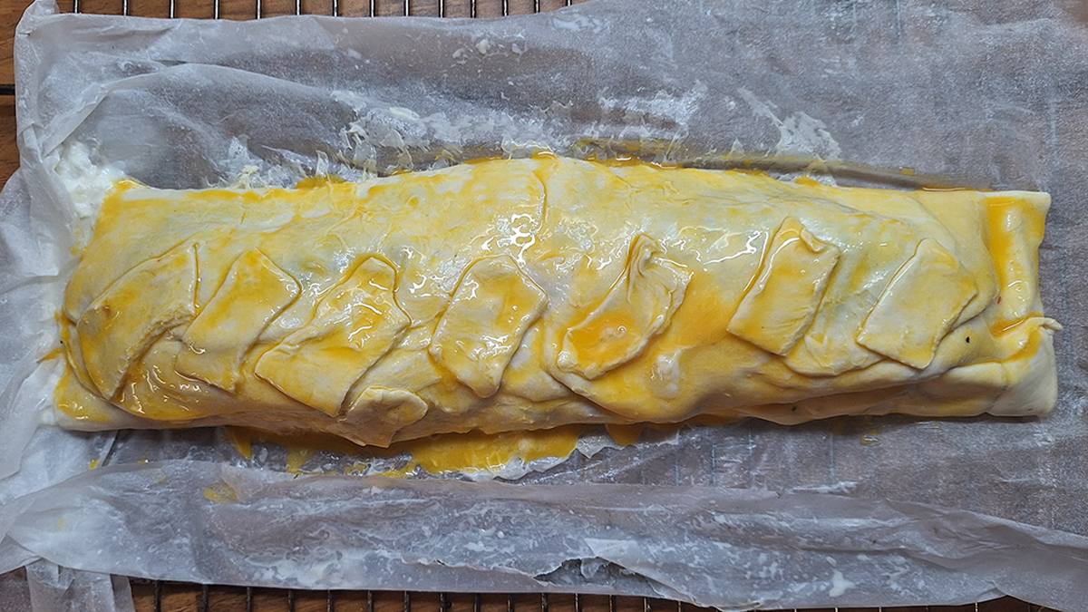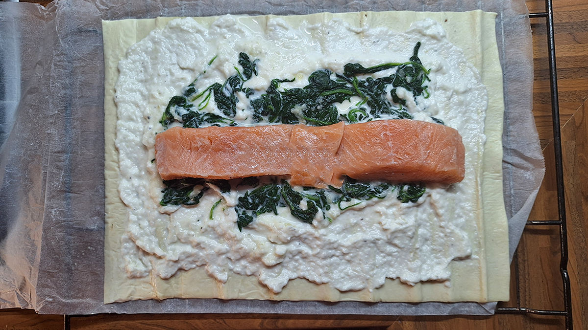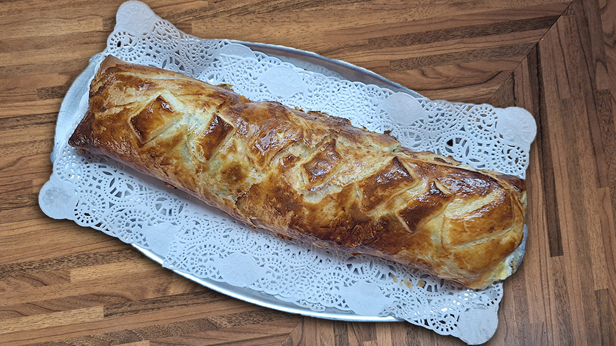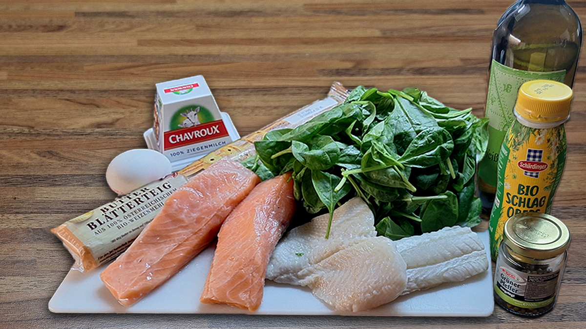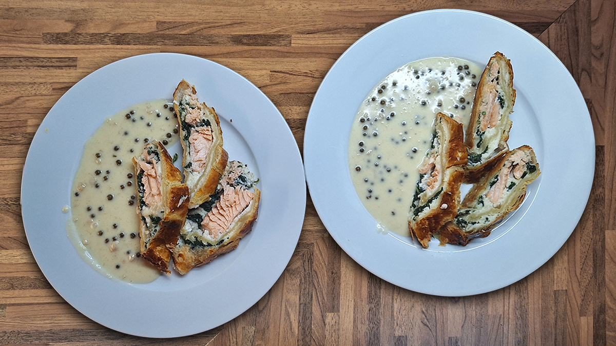 Lachsfilet in Blätterteig, mit einer Farce vom Heilbutt, Kabeljau und Spinat. Serviert mit Obers-Weinsauce mit grünem Pfeffer blätterteigfischfischfiletheilbuttlachsfiletpastetespinatstrudel By lintschi5. November 2025FischLeave a Comment on Lachsfilet in Blätterteig